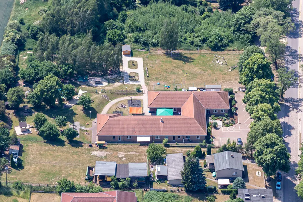 Die im Luftbild zu sehende KITA Wilde Wiese in Wegendorf kann bis zu 77 Kinder betreuen.