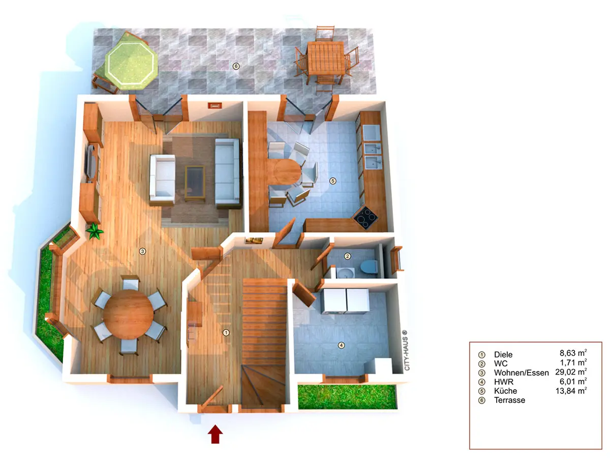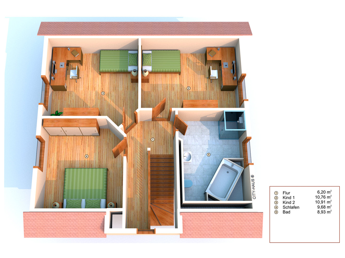 Für Ordnung im Haus sorgt ein separater Hauswirtschaftsraum, der sich im Erdgeschoss befindet und Anschlüsse für eine Waschmaschine bereithält. Das über eine Vollholztreppe zugängliche Dachgeschoss ist durch den großzügigen Ausbau äußerst bequem nutzbar, die im Obergeschoss liegenden Räume sind in unserem Vorschlag gleichmäßig aufgeteilt.