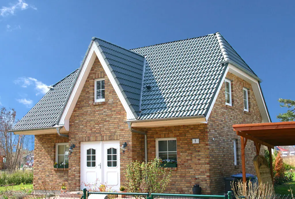 Der sogenannte Friesengiebel prägt die Front des Hauses, die Krüppelwalme an den Giebelseiten ergänzen das Konzept.