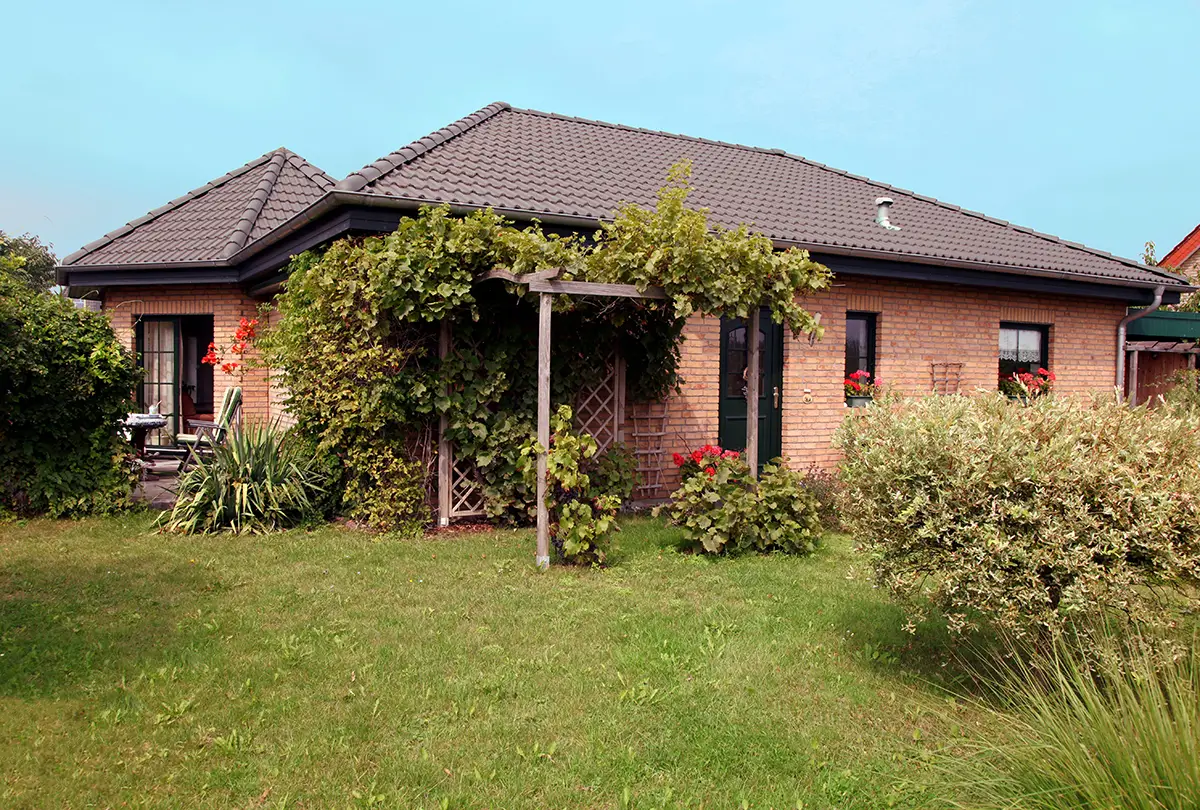 Eigentlich ist das Haus im Bungalow-Stil geradlinig geschnitten, doch der stattliche Turmerker weitet den Wohn- und Essbereich hinaus in den Garten. Der Wohnbereich verfügt so mittels zweiflügeliger Tür über einen direkten Zugang zur Terrasse.