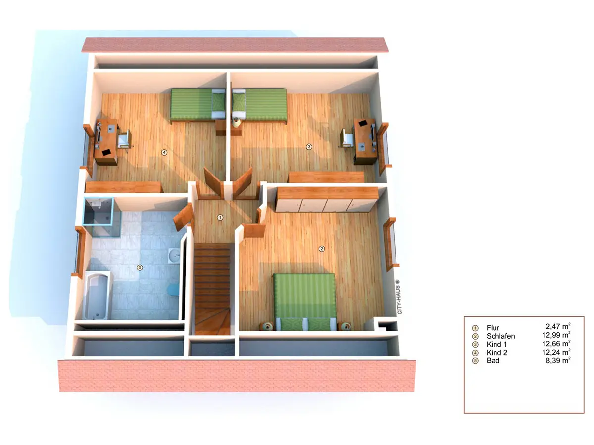 Im Obergeschoss geht es in der hier gezeigten Variante gerecht zu. Alle drei Schlafzimmer sind etwa gleich groß und haben bequemen Zugang zum Familienbad.