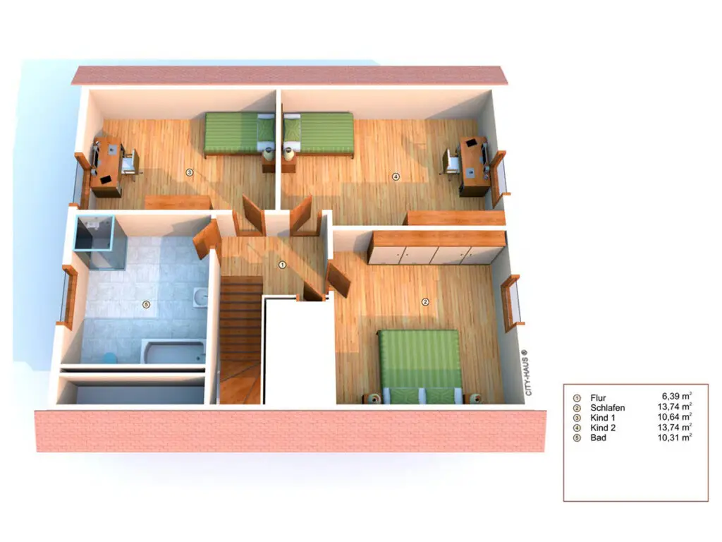 Die repräsentative, massive Erscheinung vermittelt Sicherheit und Geborgenheit. Der verfügbare Platz ist vielfältig plan- und nutzbar und bietet für jedes Familienmitglied einen Rückzugsort. Das gemütliche Wohnzimmer verlängert sich durch einen großen Standarderker mit Oberlichtern. Hauswirtschaftsraum und Gäste-WC sind bei dieser Geschossfläche obligatorisch. Gefliest sind hier nicht nur die Bäder und Küche, auch Hauswirtschaftsraum und Diele sind so leicht zu reinigen. Im Obergeschoss zeigt sich eine faire Gliederung mit drei etwa gleich großen Zimmern unter schönen Dachschrägen. Der Flur erhält zusätzliches Licht durch ein Dachflächenfenster und natürlich sind alle Räume mit Fenstern versehen.